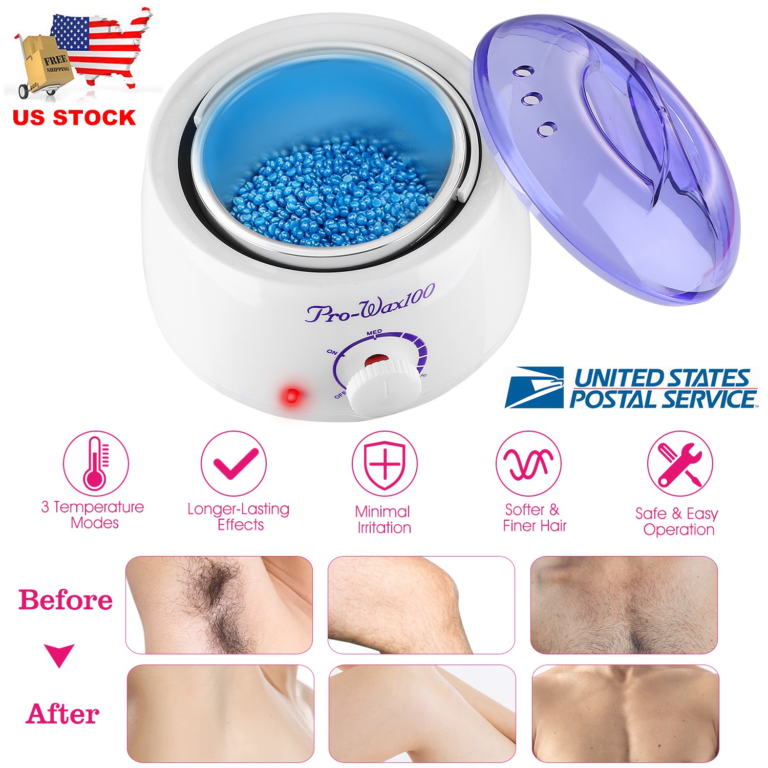 Are you tired of the unwanted hair aroung your body and eager to show your charming figure in Summer? Our economical wax warmer machine is designed for you easily achieving nursing your body skin, a great gift for your family and friends to remove their unwanted hair. It can be used for hair removal nursing, beauty care and skin care, and suitable for all types of therapeutic waxes including wax beads, hair removal hard wax beans, wax bars, etc. This wax warmer machine is popular among any professional esthetician. Widely used in salons and spas. Also it can be used by women and men at home. Equipped with a circular heating element and an adjustable thermostat control knob (3 levels: low-medium-high) for wax quickly getting into liquid consistency at 210℉, then it can be applied to skin after 40-minute heating. Moreover, it’s designed with visible vented cover, which allows for easy monitoring of wax meltdown status, and maintaining heat and preventing contamination. What an excellent option for nursing body skin it is!