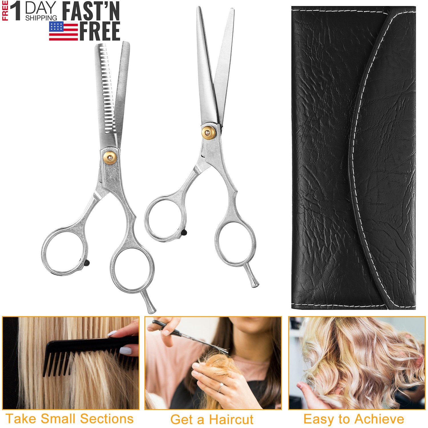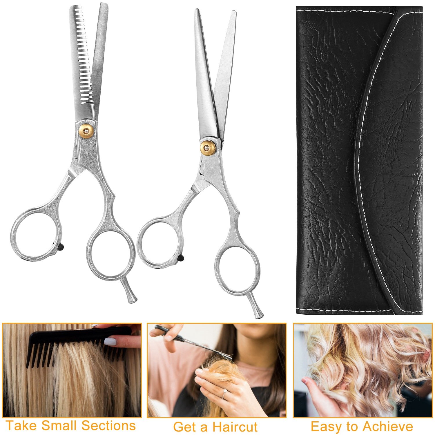 Our 2 pcs hair cutting scissors set including a straight scissors and a hair thinning scissors, which are made of premium-quality stainless steel, abrasion-resistant, rustproof and durable. Our hair cutting scissors give a clean cut, which is great for trimming bangs or wigs. The hair thinning shears has 22 teeth on one side, giving your hair a suitable thinning rate, which is perfect for men/women to add layers, thin out thick hair or wigs and texturize hair for stylish looks. The PU leather case organize the scissors set properly and provide extra protection by preserving scissors and preventing accidents, also, makes it more portable. This hair cutting scissors set is a great choice for both professional hairdressers (barber shop or salon workers) and home users, widely used for hair trimming to children, men, women or the elderly.